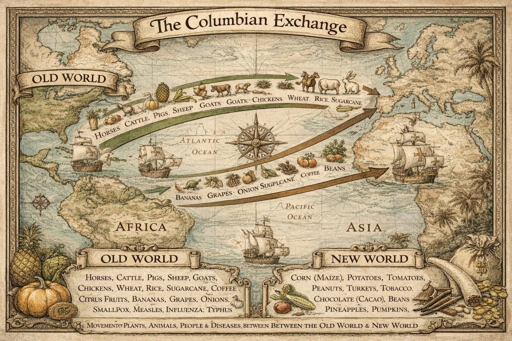 The Columbian Exchange that followed reshaped life across the globe, bringing new foods, animals, and ideas—but also conflict and suffering.