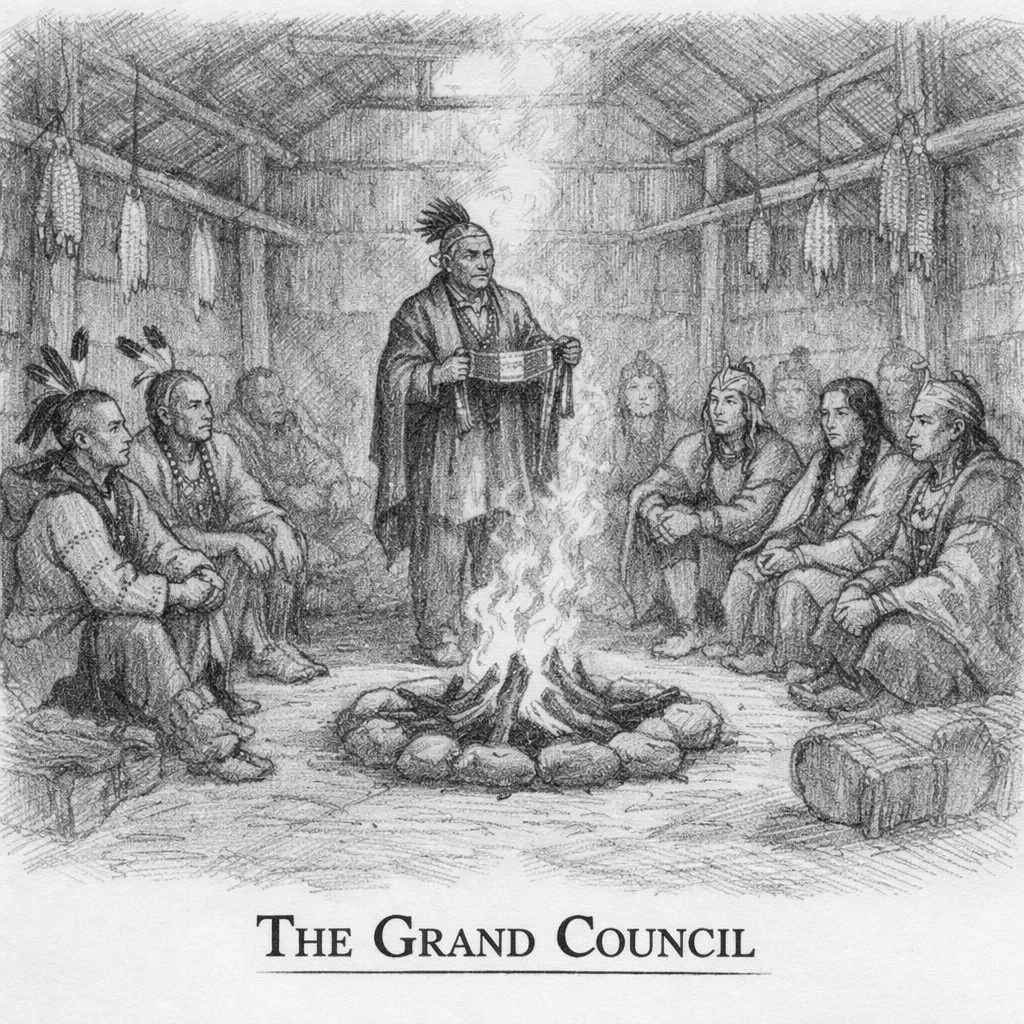 The Haudenosaunee Confederacy was more than a military alliance. It was a system of governance rooted in diplomacy, shared law, and cultural unity. Its founding narrative tells of rival nations brought together through a message of peace and mutual responsibility. The confederation’s governing principles were preserved through oral tradition in a body of law called the Great Law of Peace, which guided relations among the member nations and structured their political system.