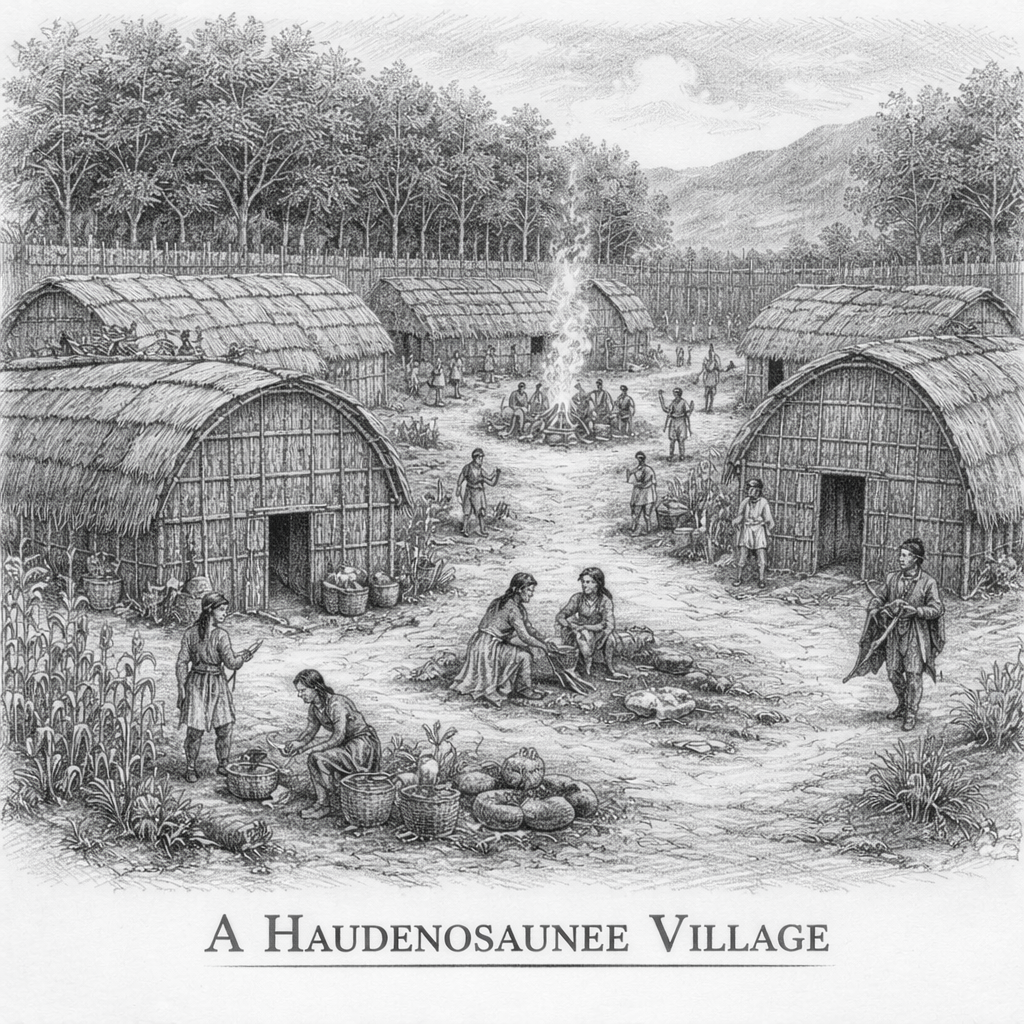 The Haudenosaunee often described their confederation metaphorically as a longhouse, a structure central to their daily lives. In a traditional longhouse, multiple families lived under one roof, sharing space while maintaining distinct households. In the same way, the confederation united several nations within a single political “house.” The Mohawk guarded the eastern door, the Seneca guarded the western door, and the Onondaga—located near the center—served as the keepers of the council fire.